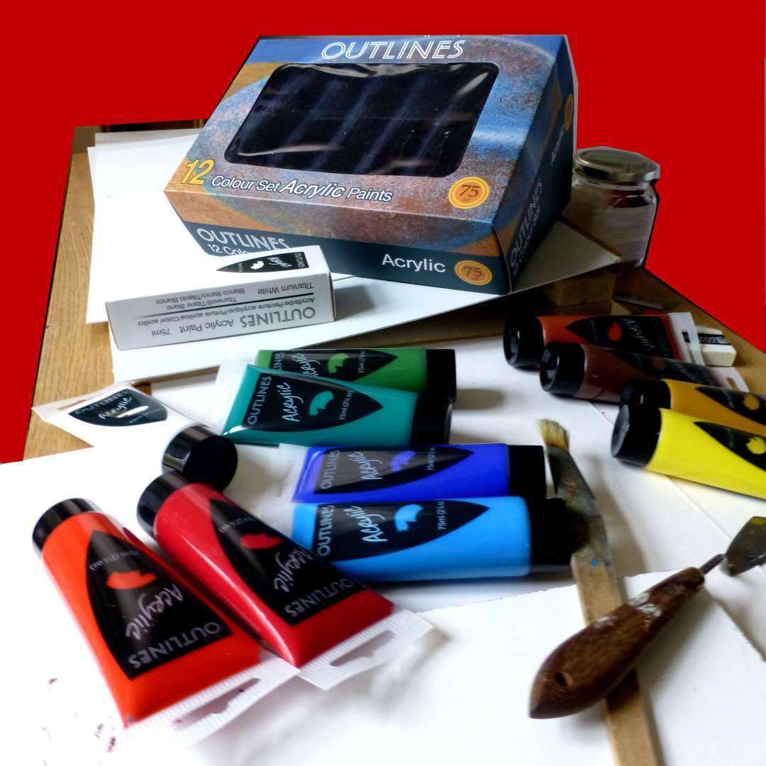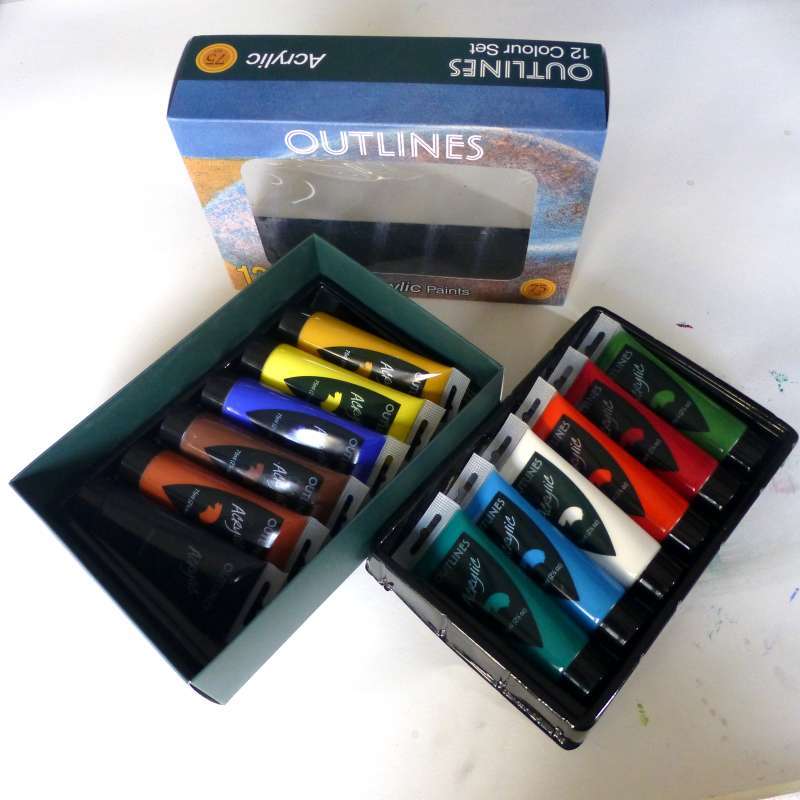 Outlines Acrylic paint set for artists, 12 colours in large tubes 75ml and one extra tube of white is a great choice to keep you painting as often as you like.